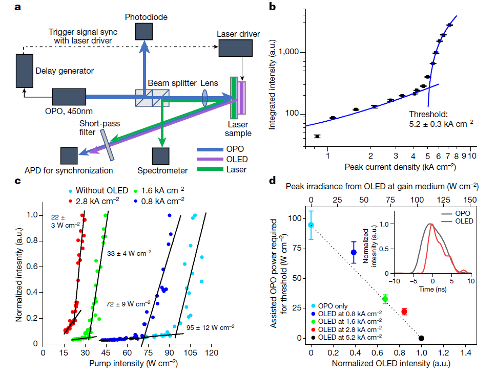 (d) 达到激光阈值所需的辅助 OPO 辐照度与 OLED 强度(归一化为阈值电流密度下的 OLED 输出,底轴)以及推断的增益介质处的 OLED 峰值辐照度(顶轴)的关系。误差条表示测量的不确定性范围,覆盖因子为 2。插图:测量期间 OPO 和 OLED 发射的时间分布及其相对定时。a.u.,任意单位;APD,雪崩光电二极管。