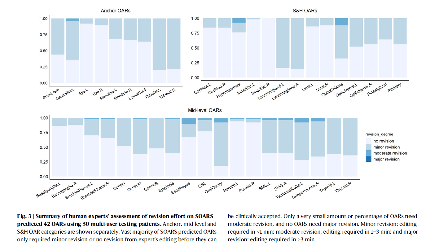 柱状图显示了锚定层、中层及小而难分器官类别的修订情况,绝大多数SOARS预测仅需轻微修改或无需修改即可被临床接受。轻微修改定义为<1分钟;中等修改为1-3分钟;无严重修改的需要。